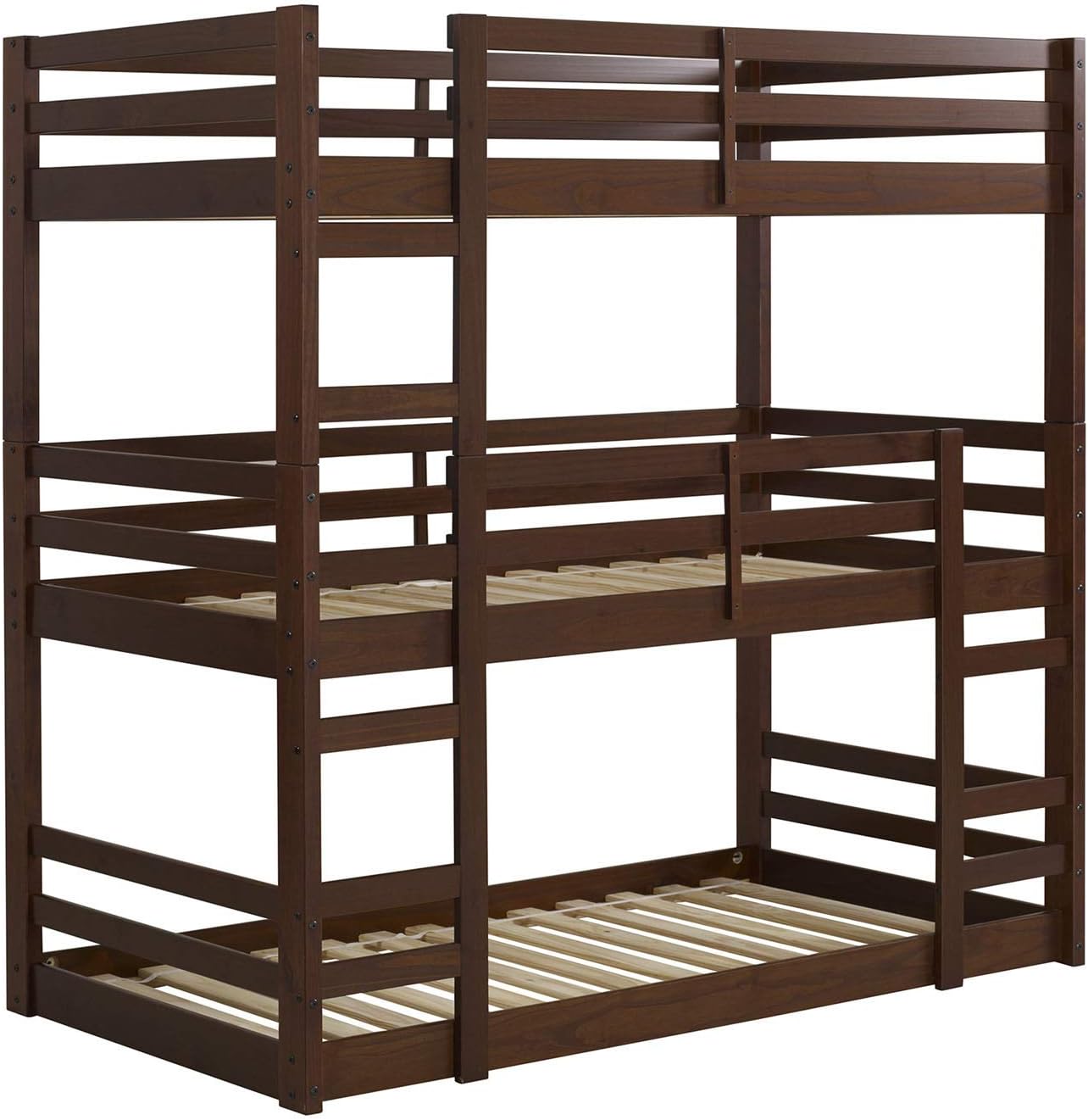 This unique triple bunk bed is perfect for your kid’s bedroom and ideal for small space living. Including three sleeping spaces for your children and providing side ladders to easily access each twin-size bed bunk. The bottom bunk is floor level, making is simple for the a smaller one to crawl in and out of bed. This solid pine wood triple bunk bed showcases a beautiful painted finish and includes support slats on each bunk, with no box spring needed. With guardrails on the two upper bunks for added safety. In a transitional and traditional design for a contemporary style that matches with multiple décor choices. If needed, this triple bunk can be separated out into a low loft and a twin bunk bed when your kids grow older. With the top bunk turning into the low loft bed and the two lower bunks as a twin bunk bed. Does not include bedding and mattress.